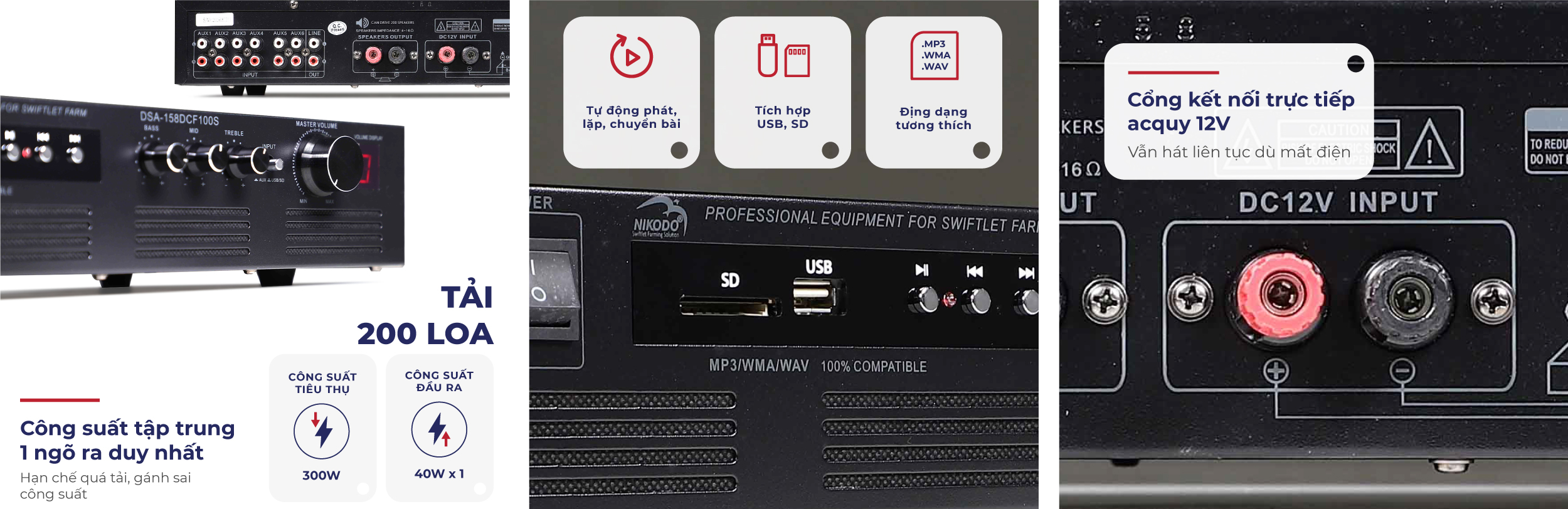 Tích hợp cổng kết nối acquy 12V trực tiếp, vẫn hát liên tục khi mất điện.