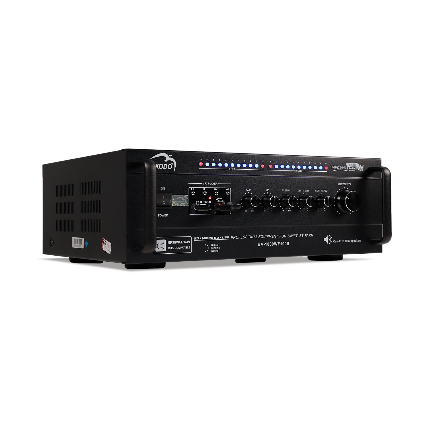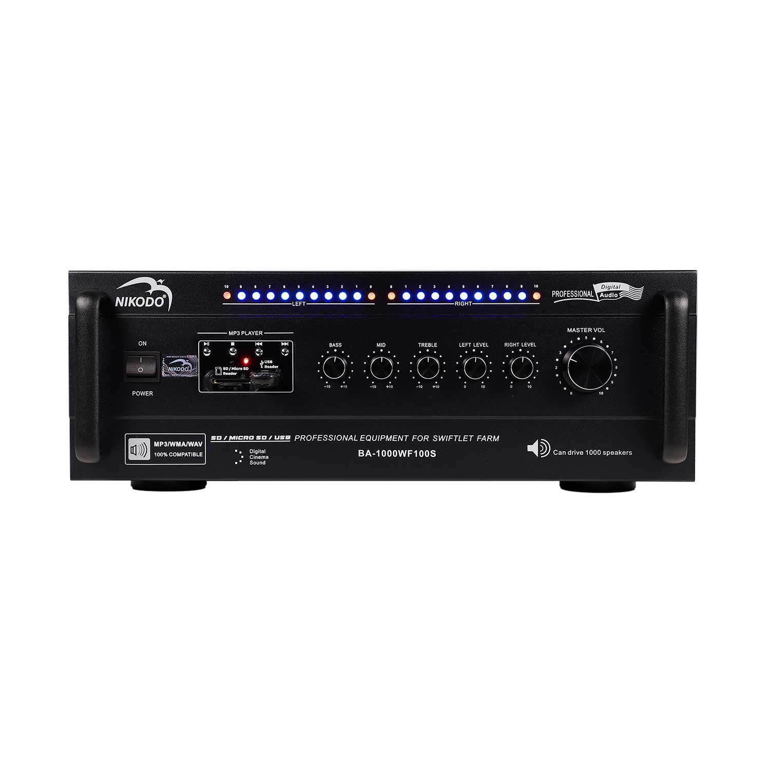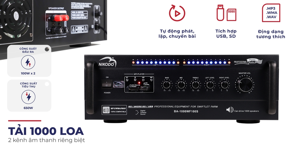 - Với công suất 200W, Amply Nikodo BA-1000 có thể tải trọng đến 1000 loa chim yến, phù hợp cho hệ thống loa ru trong nhà yến cực lớn.