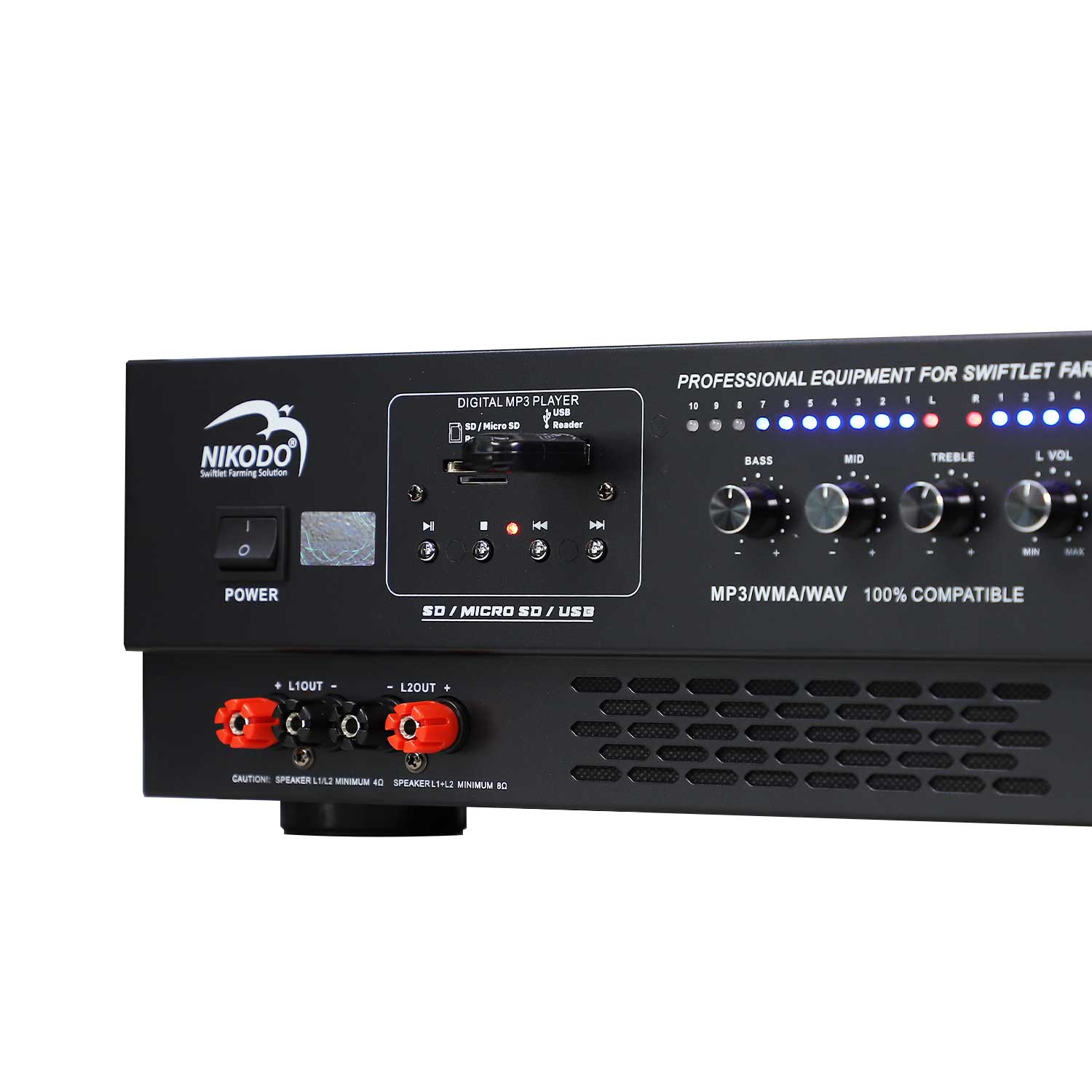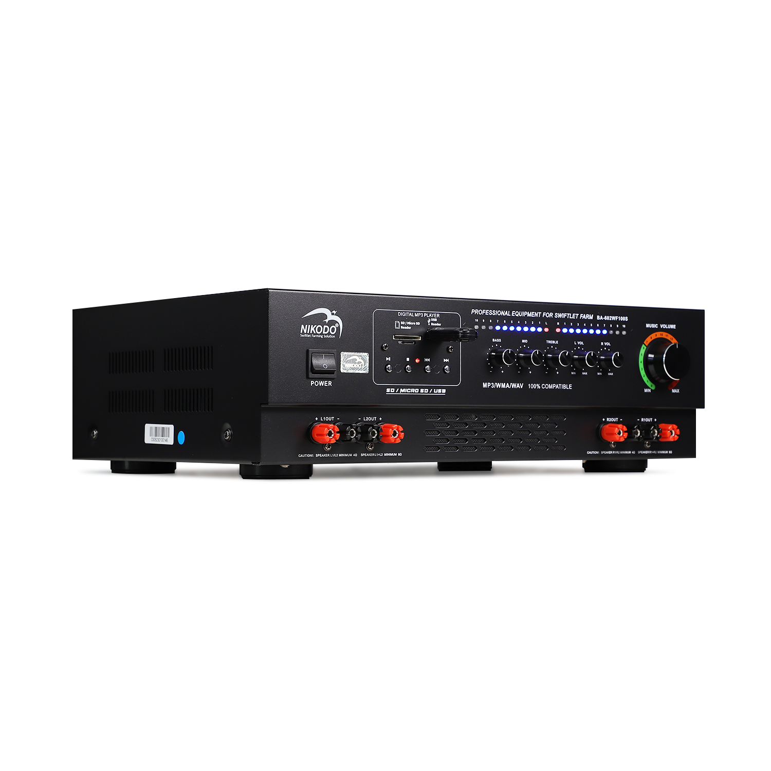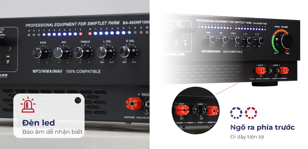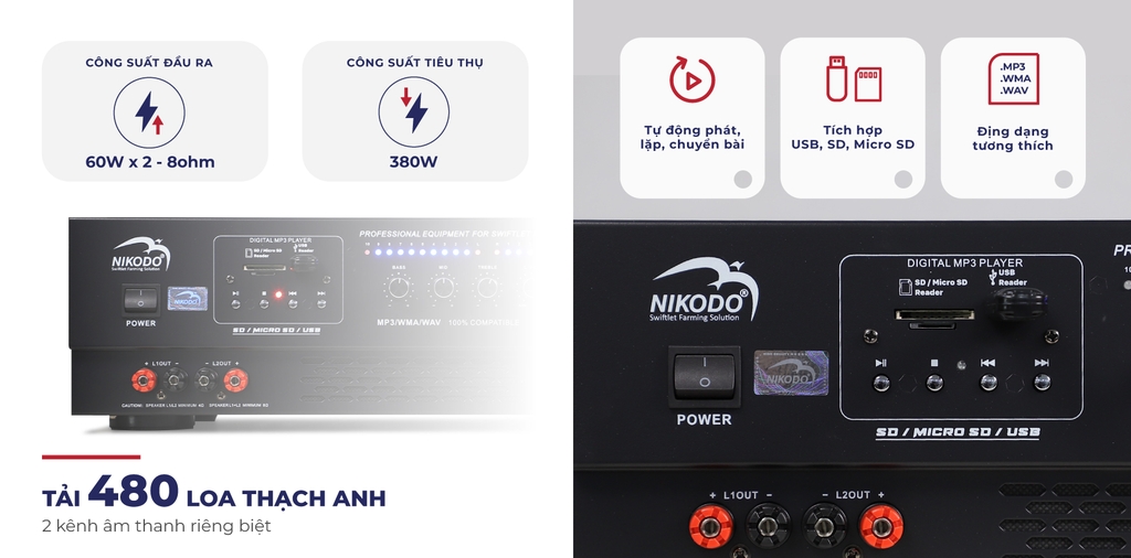 - Với công suất 120W, Amply Nikodo BA-602 có thể tải trọng đến 480 - 600 loa ru, phù hợp cho hệ thống loa ru trong nhà yến lớn.